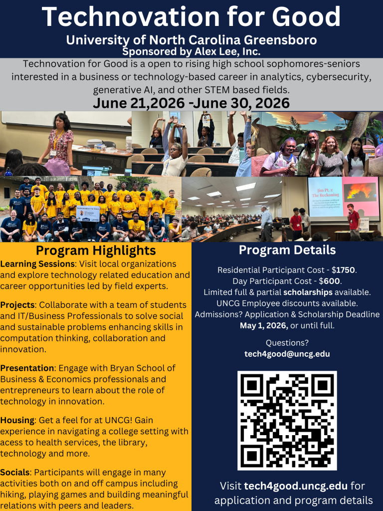 Technovation for Good, is a day and residential program for rising high school sophomores – seniors. The program will be administered by the Information Systems and Supply Chain Management department in the Bryan School of Business and Economics at the University of North Carolina Greensboro. It will provide the participants with hands-on, practical experience with Programming, Cybersecurity, Data Analytics, Mobile Application Development, Sustainability, Analytics and/or the Internet of Things. Thanks to our sponsor Alex Lee Inc., limited partial or full scholarships are available to ensure that students can participate in the program.